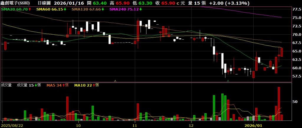 鑫創電子(6680)主要業務為智能車載電腦與嵌入式電腦,12月營收為7505萬,年增18.1%,股價反彈挑戰季線