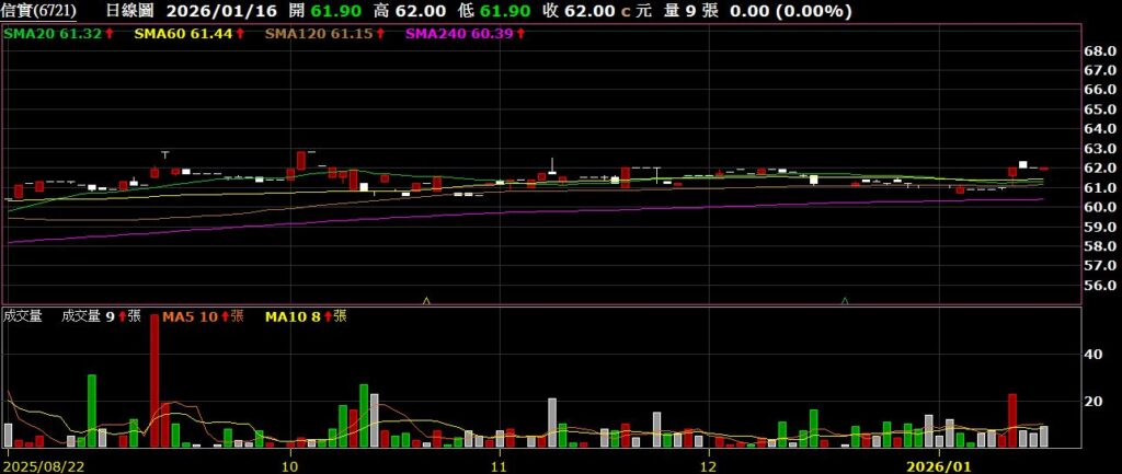 信實(6721)清潔保全公司,12月營收為3.37億,年增9.62%,營收創下歷史新高,股價緩步往上墊高