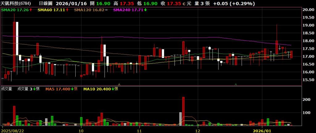 天凱(6784)主要有天線、穿戴裝置與車用電子三大業務,12月營收為4435萬,年增62.84%,股價創波段高後,回測半年線