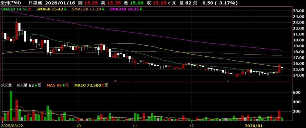 聖州(7764)全球前三大車用踏墊商,12月營收為7465萬,年增10.73%,股價向上突破季線