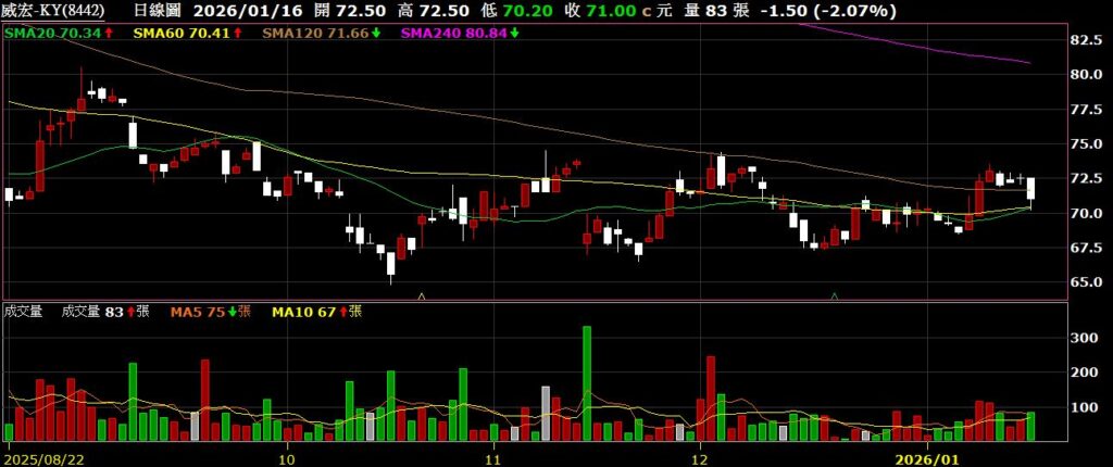 威宏-KY(8442)運動裝備及精品包袋製造商,12月營收為7.19億,年增21.66%,股價回測月線