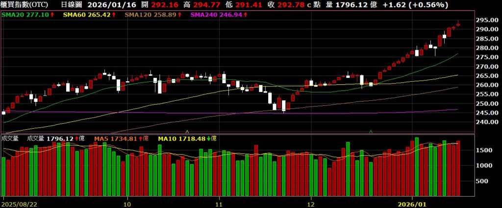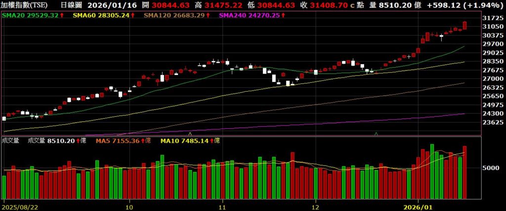 回到個股上面來,上週台美雙方達成台灣關稅調降為15%並不疊加MFN、半導體及半導體衍生品等232關稅,作為交換,台灣半導體及科技產業則將對美國進行至少2500億美元自主投資,台灣政府將提供至少2500億美元的信用保證,而台積電公布第四季財報,第四季毛利率為62.3%,營業利益率54%,稅後純益率48.3%,EPS為19.5元,優於市場原先預期,公布後也讓台積電最高來到1750,不過台積電一漲,資金又被集中到相關個股上,也讓盤面上形成站上三萬一,但許多股票都是下跌;上周特昇-KY公布12月營收為8465萬,年減29.61%;信實公布12月營收為3.37億,年增9.62%,營收創下歷史新高,全年EPS估計有5元以上水準;上週土方之亂的消息持續延燒,土方廢棄物清運龍頭可寧衛周漲幅7.81%,同樣為環境工程廠商的裕山,也受到資金的追捧,單周漲幅14.12%,未來若環保法規持續轉嚴,對於像裕山這類具備規模與特許權的廠商將會是持續性利多;長榮航也有新聞,總經理孫嘉明指出,客運第一季較去年同期成長,第二季也不錯,今年客運市場預估整體攀升,貨運方面,受惠AI伺服器出貨暢旺,以及東南亞汽車零組件、成衣等,貨運仍在成長趨勢,樂觀看好客貨運成表現,七月也將新增華盛頓航點,全年營運將力拚超越2024年水準,再創新高,而近期的航空運價也持續再創高,不過股價並未反映;上週持股無動作。以下資訊擷取自XQ操盤高手。