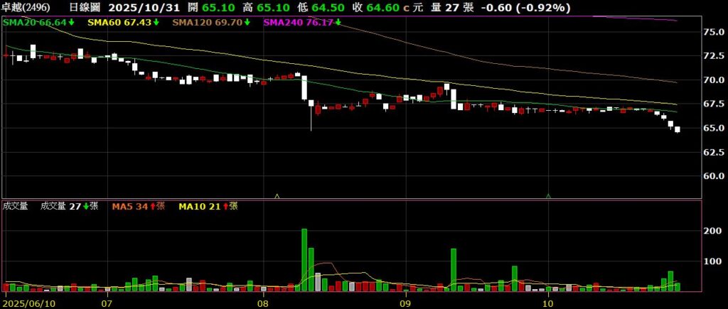 卓越(2496)補教業者,九月營收為7844萬,年增5.76%,股價盤整後破底,創波段新低