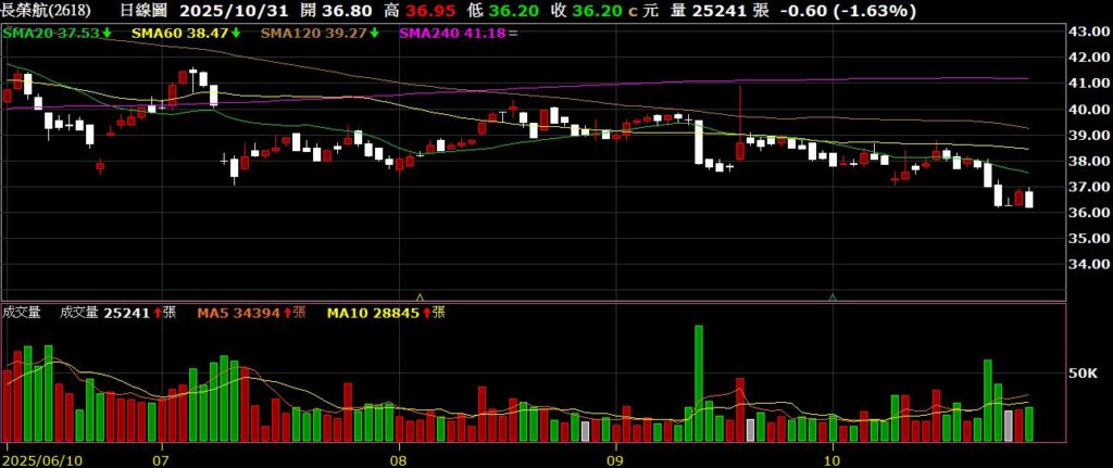 長榮航(2618)航空公司,九月營收為156.17億,年減10.03%,股價拉回破底創波段新低