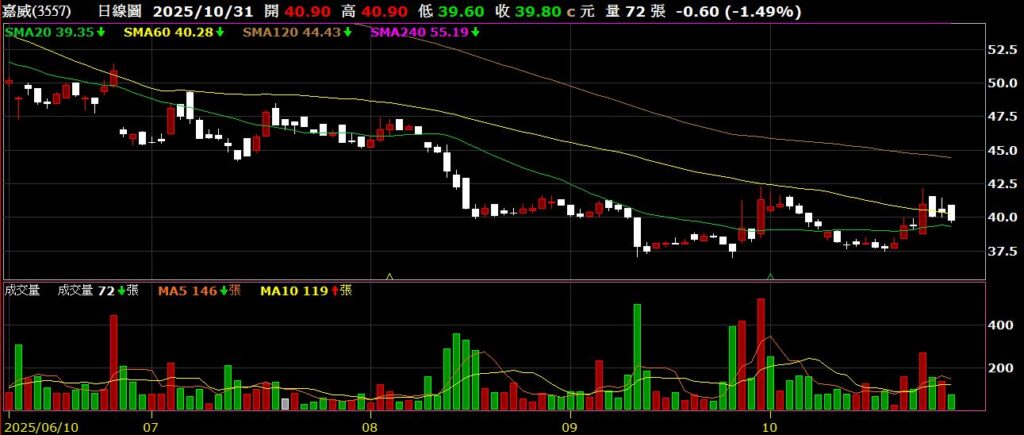 嘉威(3557)生活餐具大廠,九月營收為2.06億,年減40.04%,股價回測前低後反彈,挑戰季線反壓