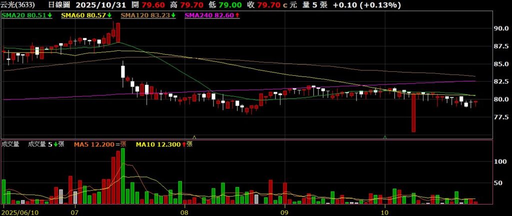 云光(3633)背光模組廠,九月營收為4.17億,年減22.63%,股價緩跌,跌破月季線