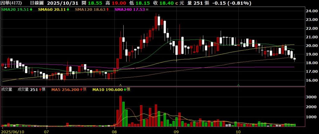 因華(4172)興櫃新藥股,九月營收為568萬,連續七個月有營收挹注,股價盤整後回測半年線