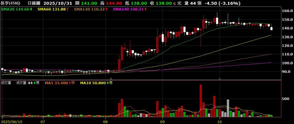 長亨(4546)飛機引擎零組件製造商,九月營收為1.81億,年增111.71%,股價高檔橫盤整理
