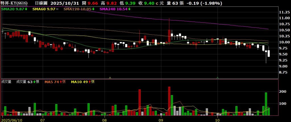 特昇-KY(6616)家具製造商,九月營收為7657萬,年減26.67%,股價盤整後破底,創波段新低