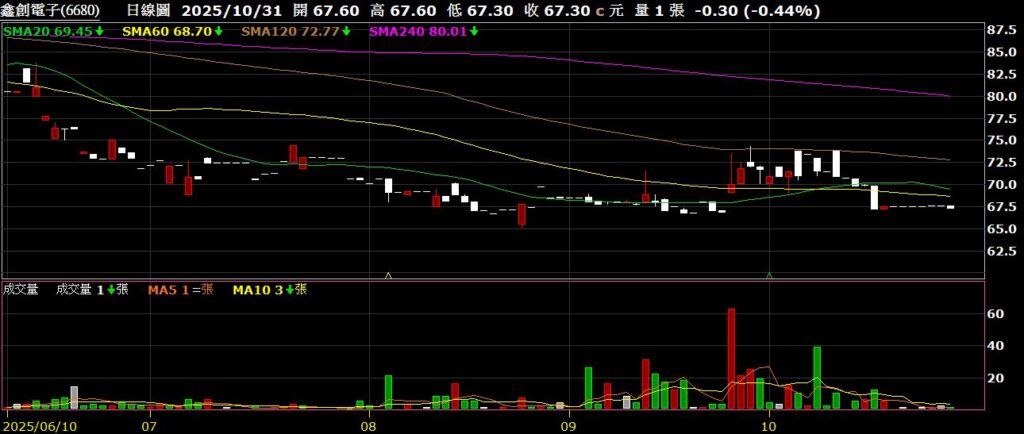 鑫創電子(6680)主要業務為智能車載電腦與嵌入式電腦,Q3 EPS為0.12元,較上季轉虧為盈,股價橫盤整理