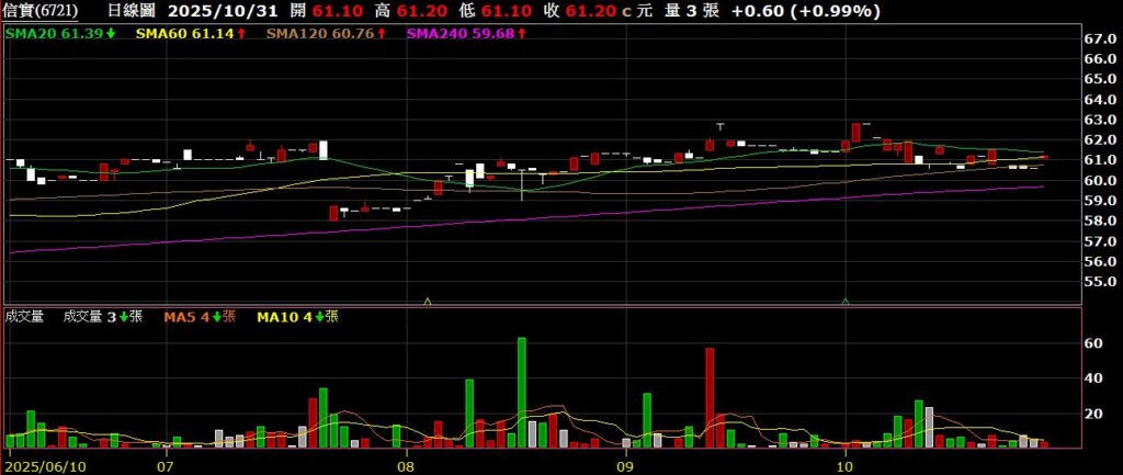 信實(6721)清潔保全公司,九月營收為3億,年增9.58%,股價在月季線間橫盤整理