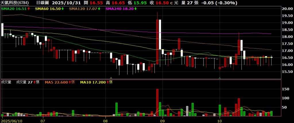 天凱(6784)主要有天線、穿戴裝置與車用電子三大業務,九月營收為3866萬,年增155.71%,股價沿月季線整理