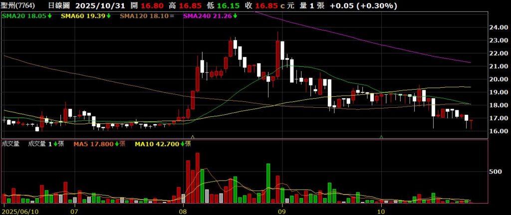 聖州(7764)全球前三大車用踏墊商,九月營收為6698萬,年增1.17%,股價回測前低