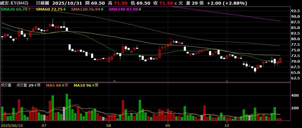 威宏-KY(8442)運動裝備及精品包袋製造商,九月營收為5.85億,年減14.52%,股價破低反彈,挑戰季線