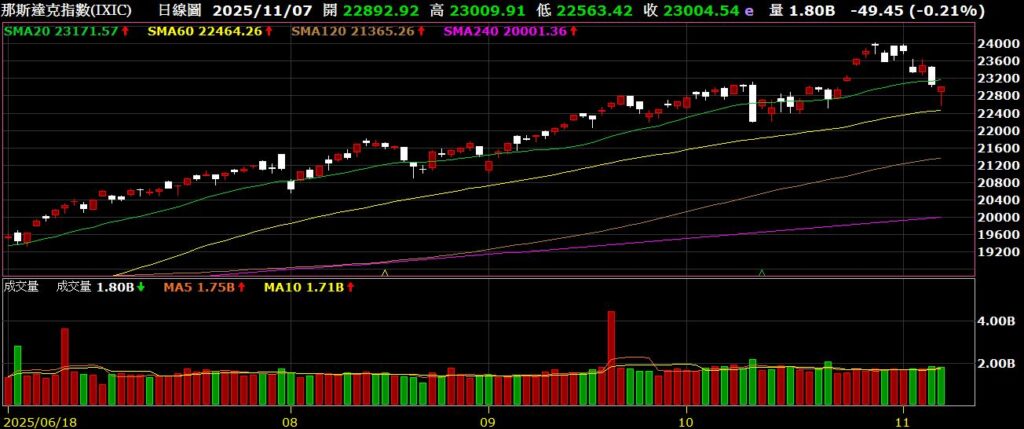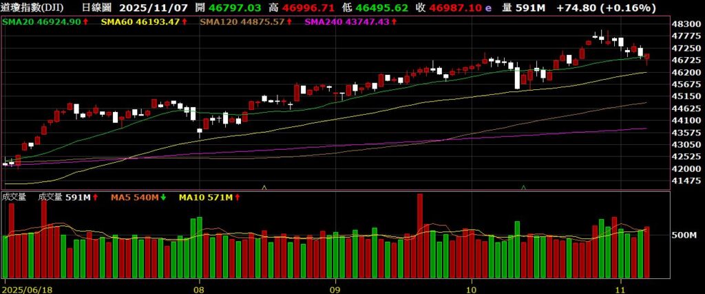 觀察美國四大指數,上週全數在高檔震盪整理;上週美國公佈十月小非農就業報告,就業新增4.2萬人,優於市場預估的2.2萬人,為近三個月來首次成長,也激勵四大指數齊揚;上週高通公布上季財報,營收112.7億美元,高於市場預測的107.9億美元,EPS為3美元,同樣高於市場預測的2.88美元,但因美國稅改,高通須在該季認列57億美元支出,因此出現31.2億美元虧損,財測預期營收約122億美元,EPS估為3.40美元,兩者都優於市場預期,公布後股價下跌3.63%;由於美國政府持續停擺,因此相關經濟數據有持續暫停提供;從FED watch觀察,12月降息一碼的機率為66.9%。以下資訊擷取自XQ操盤高手。